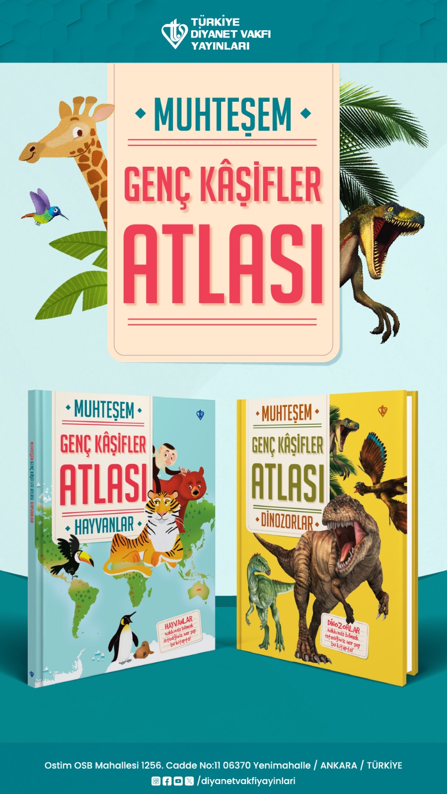 Türkiye Diyanet Vakfı Yayınları, İslam kitapları ve hediyelik ürünler alanındaki geniş yayıncılık ağını, genç okurlar için de her geçen gün genişletiyor. Çocuk kitapları ve genç kitapları kategorilerinde hem eğlenceli hem öğretici birer kaynak olan “Muhteşem Kâşifler Atlası Hayvanlar” ve “Muhteşem Kâşifler Atlası Dinozorlar”ı satın almak için TDV e-satış sitesi ve TDV Kitabevlerini ziyaret edebilirsiniz.